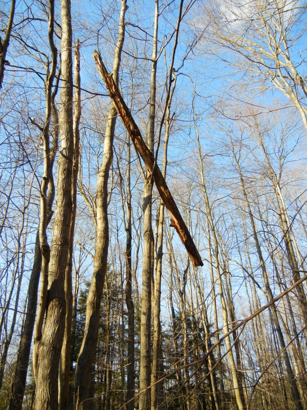 So I called this post “look up part 2” because, of all the things I learned in the safety class, the one that has stuck with me most was the reminder to always assess potential hazards from above BEFORE STARTING TO CUT. This can include: dead branches, neighboring trees with intertwined branches that could snap while felling your target tree, or just wood lodged in the crotch of a tree that could fall on you in the earth-shaking felling process—collectively known in certain circles as ‘widowmakers’ (see photos below). Despite the very real dangers of working with a chainsaw, most fatalities in the woods happen not due to severed limbs, but to the blunt trauma of being clobbered in the head by hundreds of pounds of wet, dense wood swinging through the air at high speed. So be sure to give a good look around, before you start the saw. Then you won’t need to get lucky.