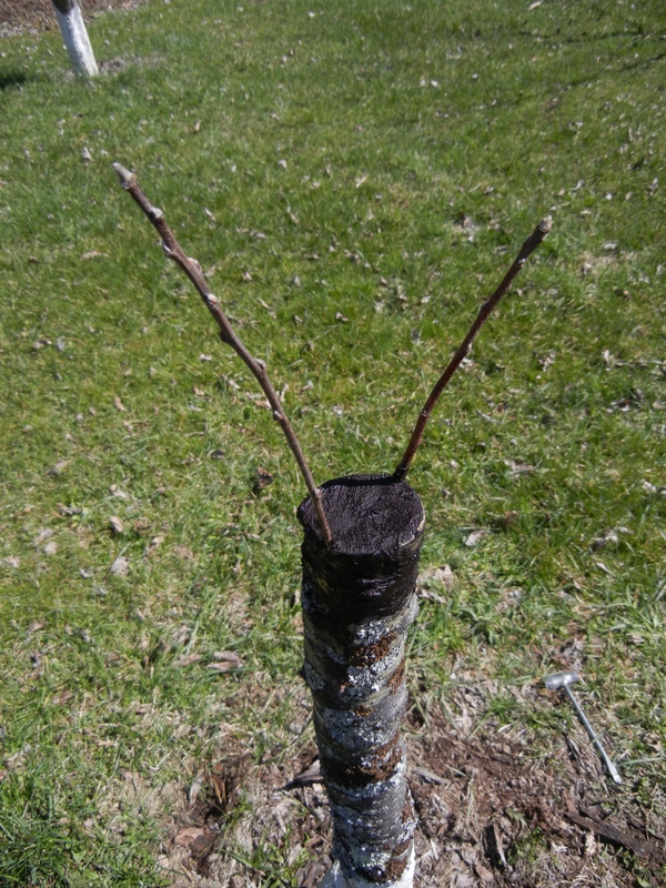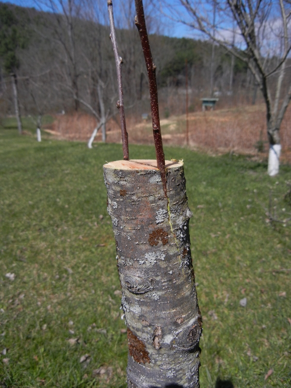 The photo above shows the lower half of a Gold Rush apple I planted a number of years ago (on M-7 semi-dwarfing rootstock). It’s a good apple, a more ‘modern’ type bred from Golden Delicious, with significant disease resistance and long storage life, but not my favorite. I had planted two in my orchard, and decided last fall that I wanted to rework one of them this year. So maybe a month or so ago, when out pruning, I cut a number of pencil-sized branch sections from a Fuji that is growing elsewhere on the property (one of my favorite varieties, which amazingly enough was bred from that dreadful excuse for an apple named Delicious, crossed with a rare 19th century variety known as Ralls Janet), and put them into a ziploc bag in the refrigerator with a few drops of water. These cuttings, which are known as scions or scion wood, are generally taken from last year’s growth, although occasionally two year old wood can be used. They are genetically identical to the parent tree—they are the parent tree, really— so can be used in topworking to propagate that parent elsewhere. They must be cut while still dormant, and either used immediately or stored in such a way to keep them from drying out (hence the refrigerator). It is vital that they have a number of dormant buds along their length—a branch tip with the terminal bud is desirable but not mandatory.